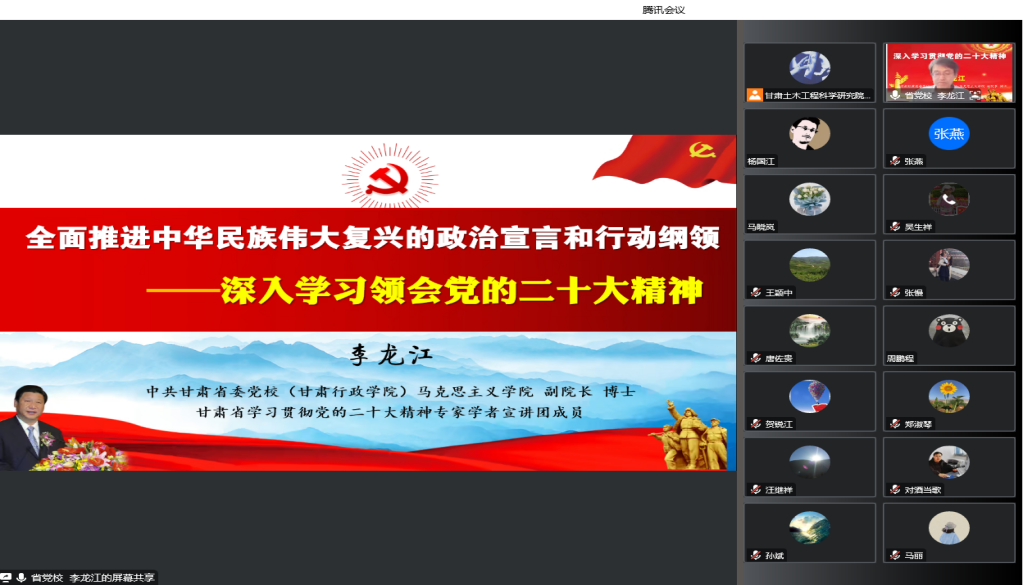 12月14日,甘肅土木工程科學研究院有限公司以視頻會議形式召開黨委理論學習中心組學習(擴大)會議暨黨的二十大精神專題培訓輔導講座。黨委副書記、監事會主席、工會主席張磊主持會議,領導班子成員、全體黨員、中層干部、入黨積極分子參加。