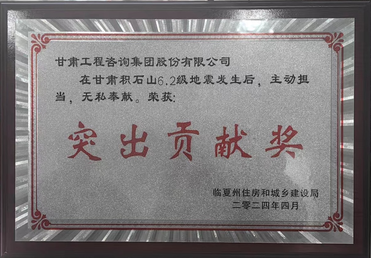 在甘肅積石山6.2級地震后,甘肅工程咨詢集團主動擔當,無私奉獻,在應急救援、災后重建工作中表現突出,被臨夏州住房和城鄉建設局授予“突出貢獻獎”。
