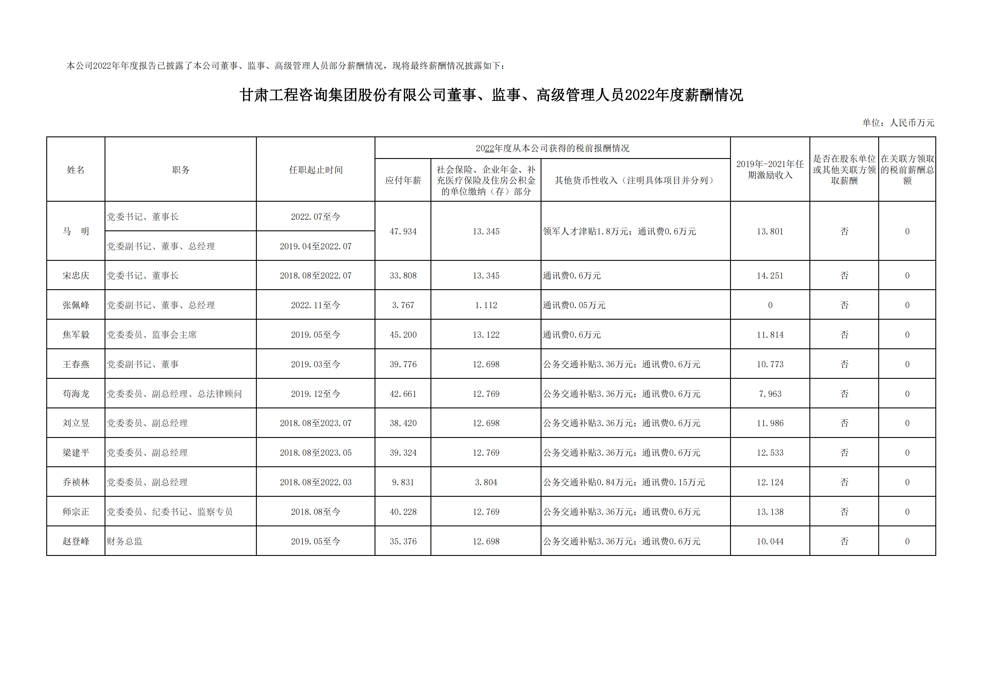 甘肅工程咨詢集團(tuán)股份有限公司董事、監(jiān)事、高級管理人員2022年度薪酬情況及甘肅工程咨詢集團(tuán)股份有限公司工資分配情況