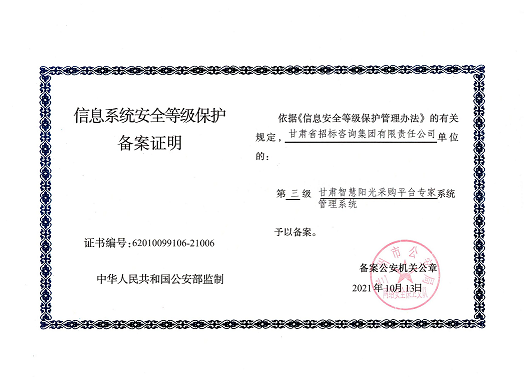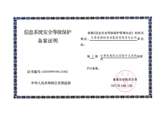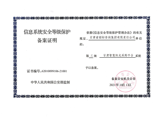 近日,由招標咨詢集團負責開發建設的甘肅智慧陽光采購平臺系統,以及甘肅智慧陽光采購平臺采購網系統、大數據監管系統、招標系統、保證金系統、專家管理系統通過國家三級等保認證,系統管理安全能力獲得業界最高標準。