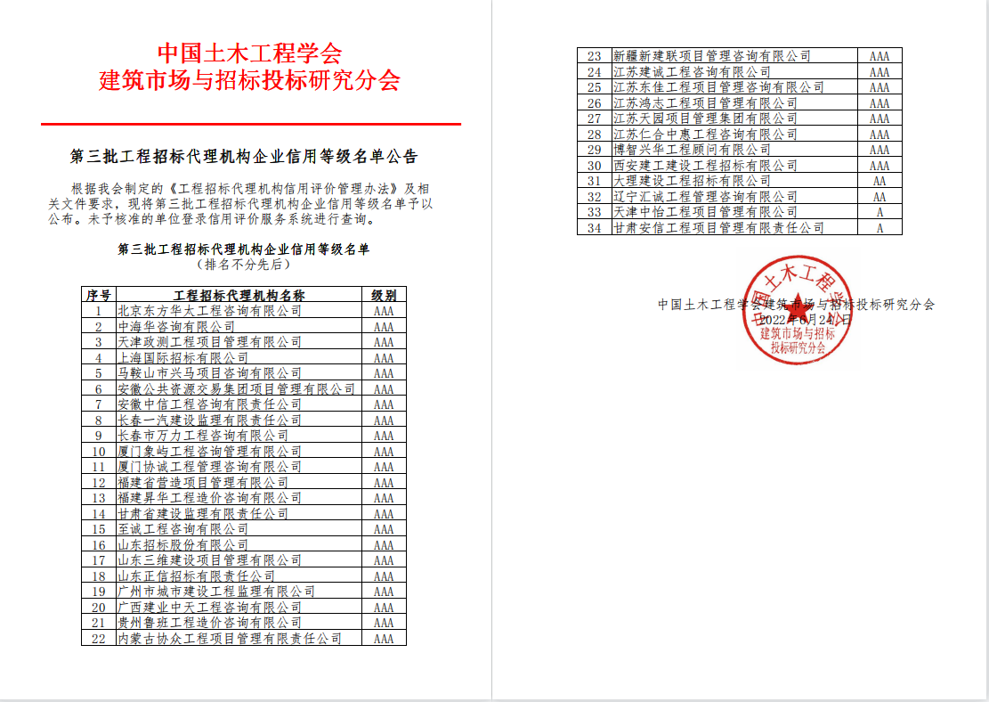 為認真貫徹落實甘肅省第十四次黨代會精神,更好地發(fā)展招標代理業(yè)務(wù),努力推進企業(yè)高質(zhì)量發(fā)展,2022年6月,甘肅省建設(shè)監(jiān)理有限責任公司積極籌備參加了由中國土木工程學會建筑市場與招投標研究分會組織的招標代理機構(gòu)信用評價,日前,第三批工程招標代理機構(gòu)企業(yè)信用等級名單公布,建設(shè)監(jiān)理公司榮獲中國土木工程學會建筑市場與招標投標研究分會招標代理機構(gòu)AAA級信用企業(yè)稱號。