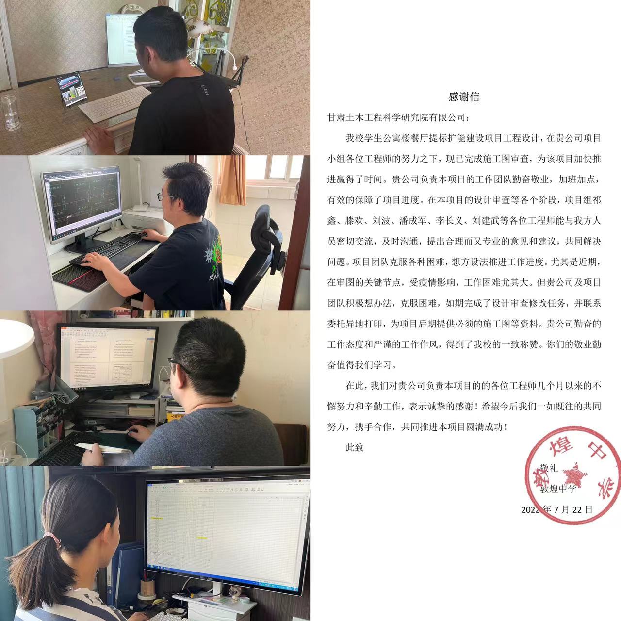 設(shè)計一所堅決貫徹土木工程院黨委要求,第一時間部署疫情防控工作。在部門職工居家辦公期間,積極與軟件公司溝通協(xié)調(diào),為所有設(shè)計軟件增加了在線使用版,并利用釘釘、微信進行線上溝通,疫情期間完成了2022年華亭市安口鎮(zhèn)老舊小區(qū)住宅樓棚戶區(qū)改造項目施工圖審查、甘肅武威工業(yè)園區(qū)天馬資源開發(fā)有限公司鋼結(jié)構(gòu)標(biāo)準(zhǔn)化廠房建設(shè)項目、敦煌中學(xué)學(xué)生公寓樓餐廳提標(biāo)擴能建設(shè)等項目,得到建設(shè)單位的一致好評和致信感謝,極大提升了部門員工技術(shù)創(chuàng)新、全方位服務(wù)的工作熱情。