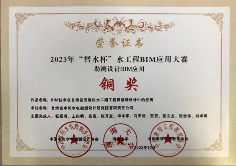 近日,中國水利水電勘測設計協會發布了2023年“智水杯”水工程BIM應用大賽獲獎項目,省水電設計院申報的《BIM技術在甘肅省引洮供水二期工程棄渣場設計中的應用》獲得勘測設計MIM應用銅獎。