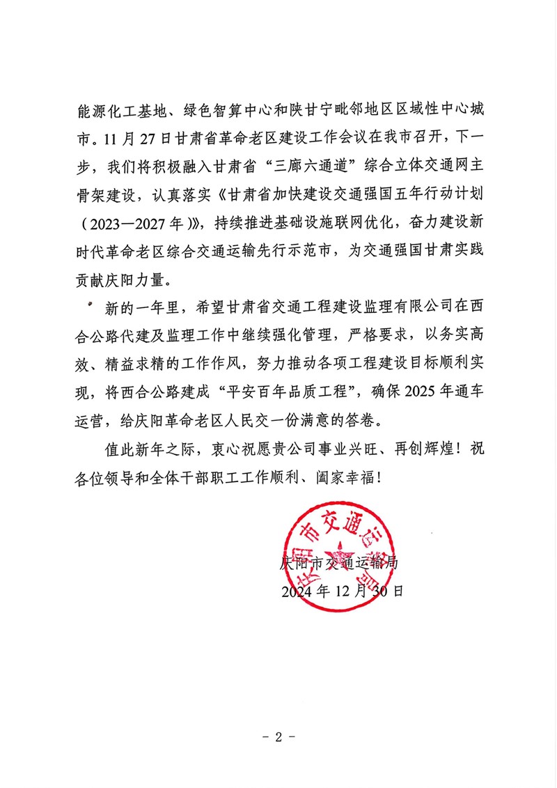 慶陽市交通運(yùn)輸局向甘肅工程咨詢集團(tuán)發(fā)來感謝信